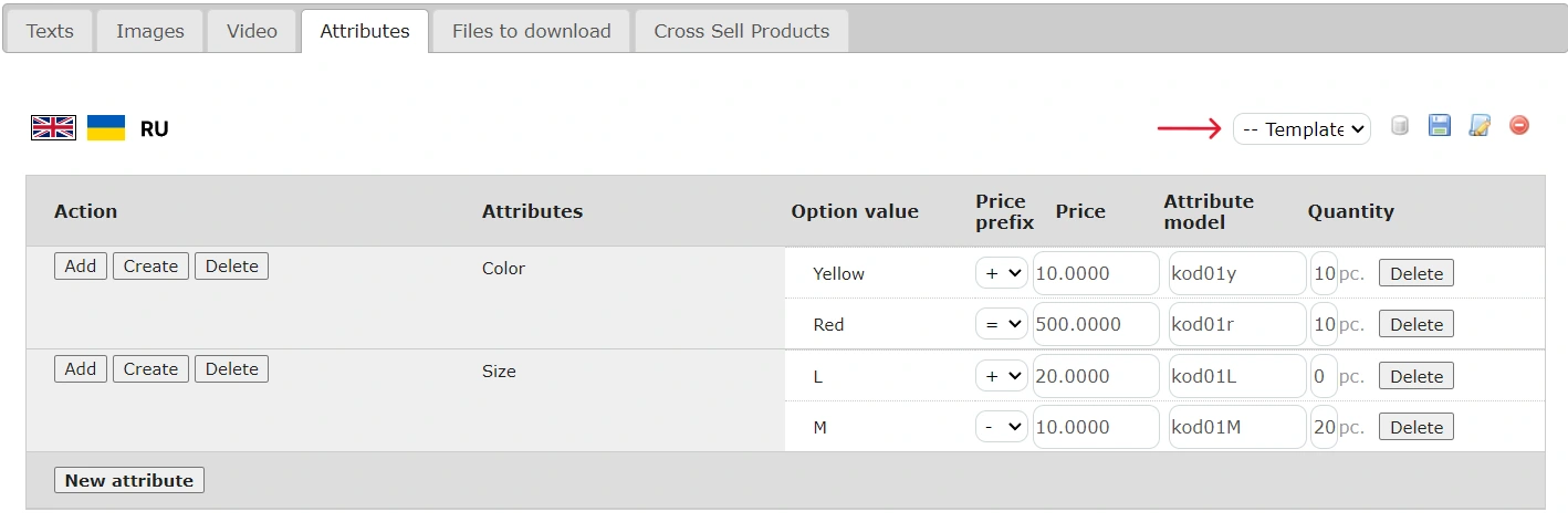 After clicking the "Save current settings as a template" button, a window will appear for entering the name of the new template, and after saving, you will be able to see this template in the dropdown list of templates. To add this set of attributes to a new product, simply go to the "Attributes" tab of this product, select the required template from the dropdown list, and click "Load the specified template".