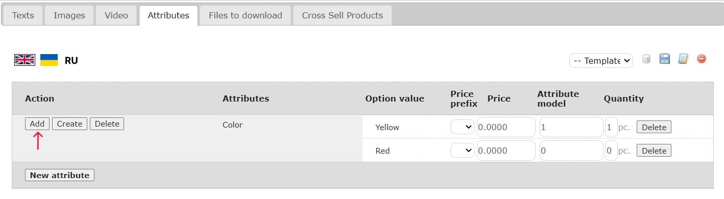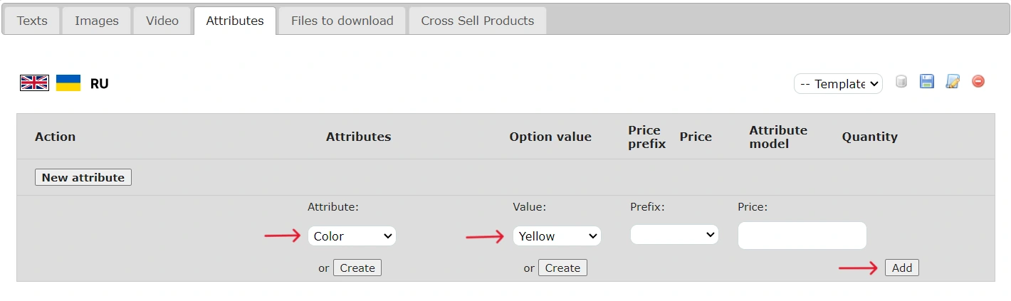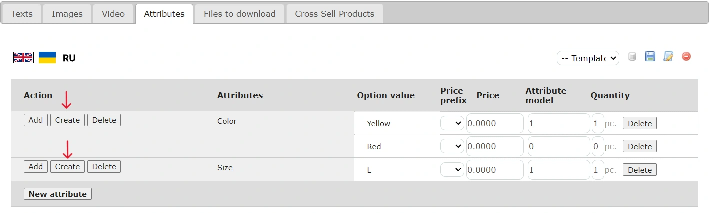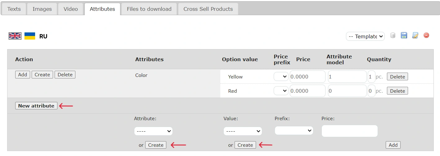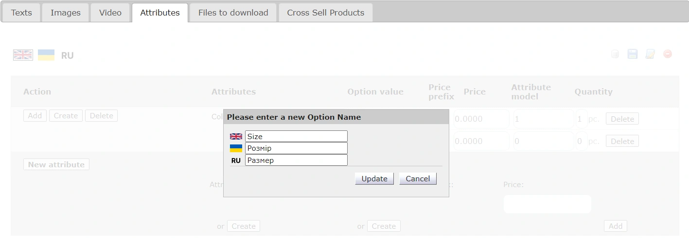 Click "Create" below the dropdown list for the attribute and enter its name for each of the languages available on the site. Then click "Update". Similarly, do so for the attribute values. You can repeatedly create attributes and values in this menu, and after creation, you will be able to see them in the dropdown lists and select the ones you need. When finished, click "Add".