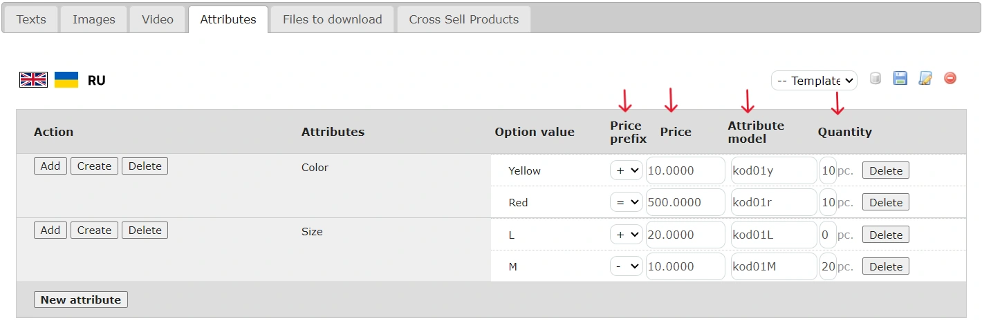 On the "Products" - "Catalog" page within the product creation or editing window, there is an "Attributes" tab. Here you have the ability to create or add already existing attributes in the system to the product card, set the price, SKU, and quantity of the product for a specific attribute value, as well as work with attribute templates.