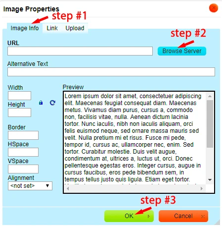 To do this, you must also click on the "Image" button in the toolbar of the text editor,