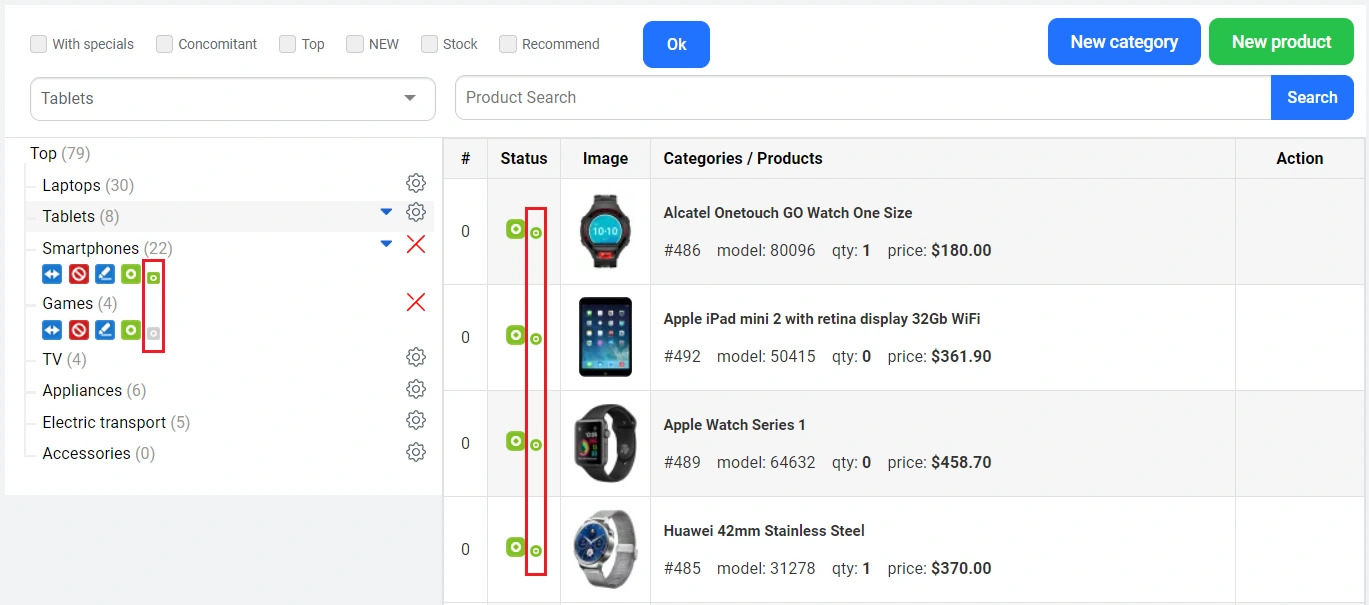 On the "Products" - "Catalog" page, you can mark which categories and products will be included in the file during XML export. This is managed by the "XML export status" switch - the right green switch in the action menu for categories and the right green switch in the "Status" column for products.